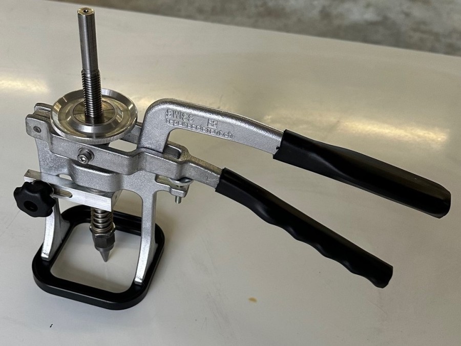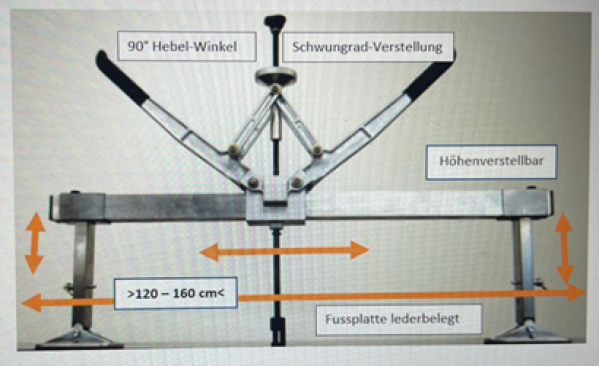 Hebelwerk seitlich verschiebbar. Abstützung höhenverstellbar. Spindel-Schnellverstellung.